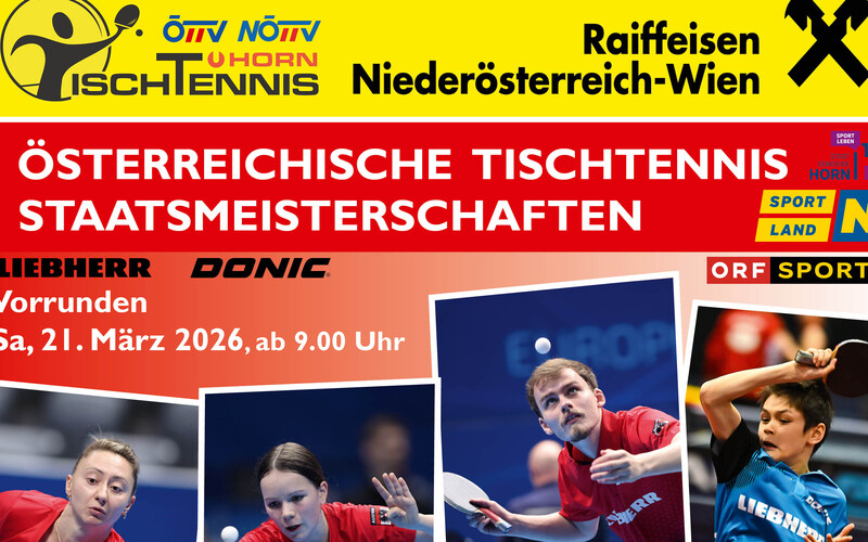 Die 96. Österreichischen Tischtennis Staatsmeisterschaften werden am 21. und 22. März 2026 in Horn (NÖ) ausgetragen Nennschluss ist am 22. Februar…
