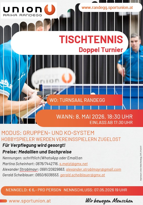 Die Union Randegg veranstaltet am 8.5.2026 ein Doppelturniet für Hobby- und Vereinsspieler. Nennschluss ist am 7.5.2026 19 Uhr.