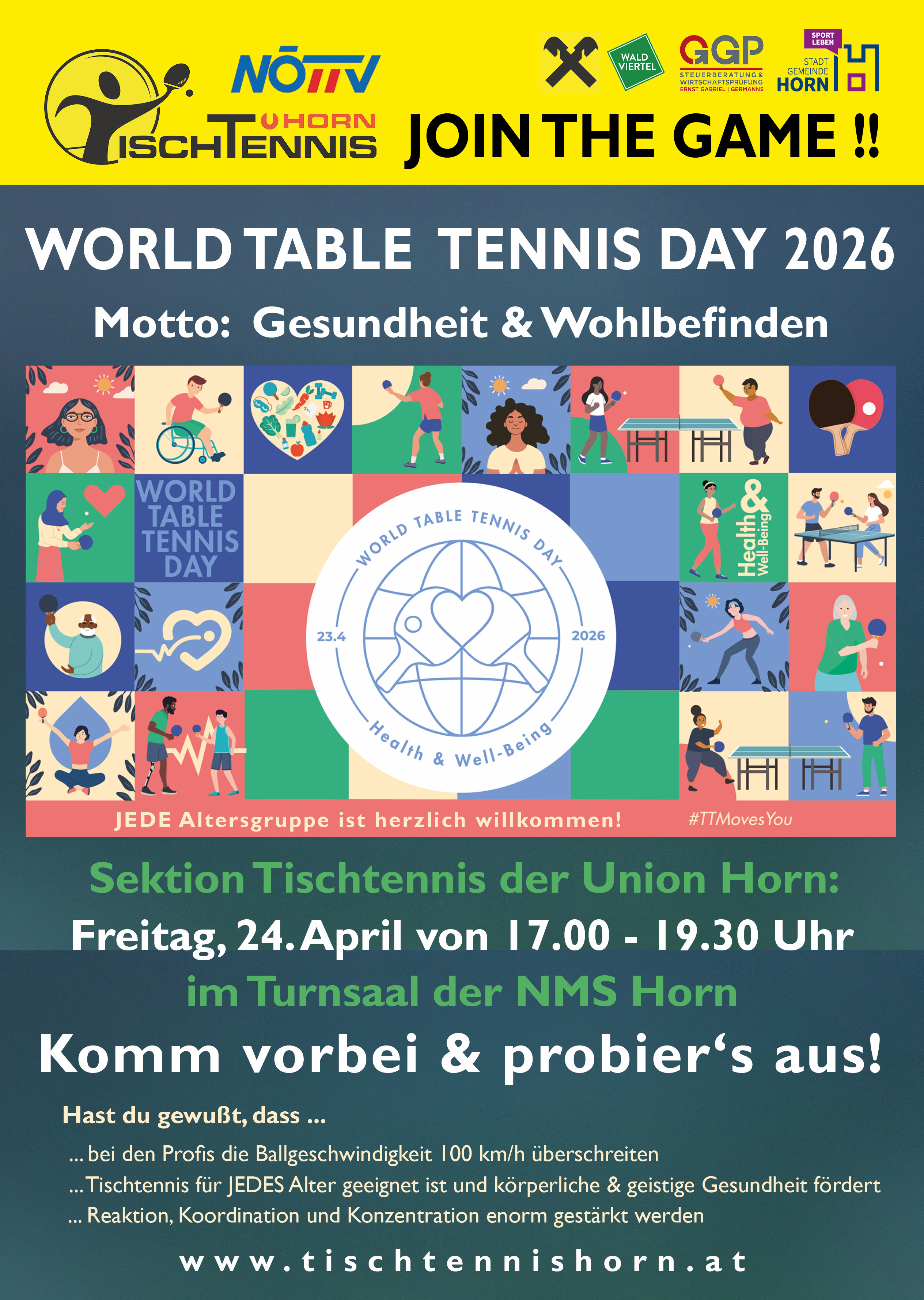 Die Union Horn, Sektion Tischtennis veranstaltet anlässlich des WTTD am 24.04.2026 ein Schnupper-, Testtraining für alle TT-Interessierte.