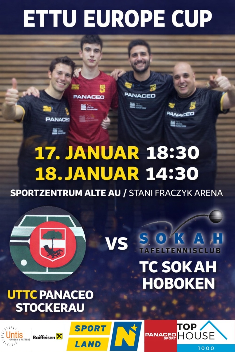 Der UTTC Panaceo Stockerau lädt herzlich zum ETTU Men`s Europe Cup gegen TC Sokah Hoboken im Sportzentrum Alte Au / Stani-Fraczyk-Arena ein!
