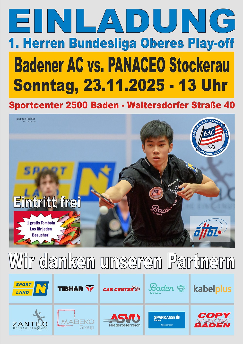 Der Badener AC-Tischtennis – der älteste Tischtennisverein der Welt – lädt zu seinem nächsten und letzten Heimspiel der Herbstrunde nach Baden ein. Die Herrenmannschaft des BAC trifft im Niederösterreich Derby auf PANACEO Stockerau. Lasst euch diesen sportlichen Leckerbissen nicht entgehen.