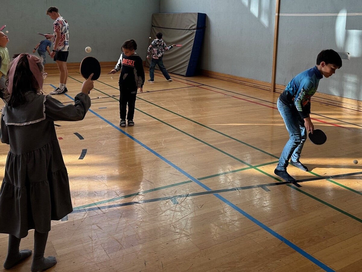 Doch bevor es soweit ist, wird nahezu der gesamte Turnsaal für weitere Übungen genutzt. Die Wände eignen sich dabei hervorragend als Rückschlagfläche, egal, ob mit der Vor- oder der Rückhand. Gleichzeitig bieten sie allen genügend Platz und zwingen niemanden, sich auf die Größe des Tisches oder ein mögliches Gegenüber einzuschränken.