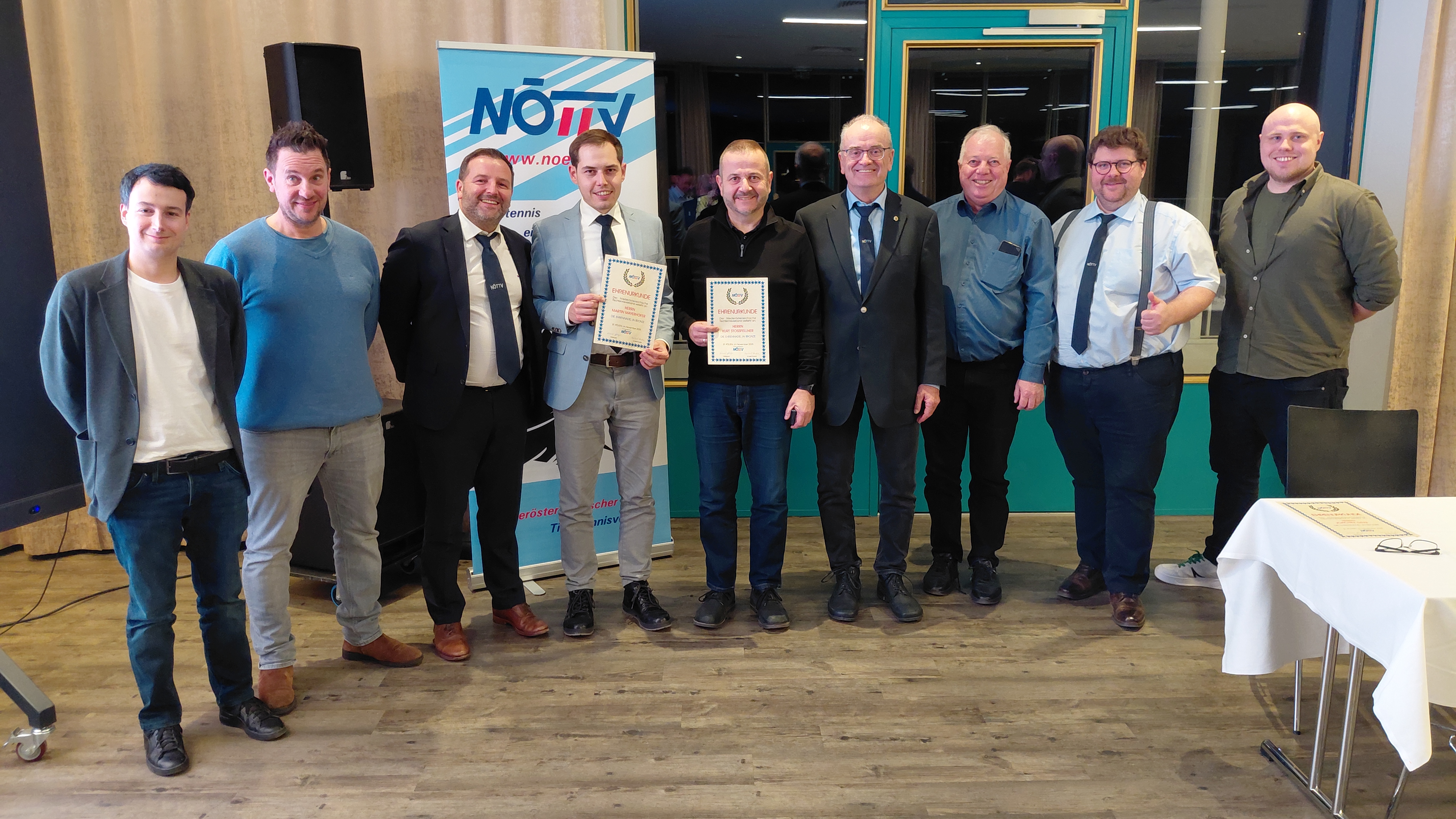 Bei dem Tagesordnungspunkt Ehrungen wurden Martin Mayerhofer für zehn Jahre in der Verbandsleitung, der für die kommende Periode als Schriftführer Stellvertreter nicht mehr zur Verfügung steht, und Kurt Stoßfellner, seit 2003 Obmann vom KSV Biedermannsdorf, für ihre langjährige und verdiente Funktionärstätigkeit mit der Ehrennadel in Bronze des NÖTTV ausgezeichnet.