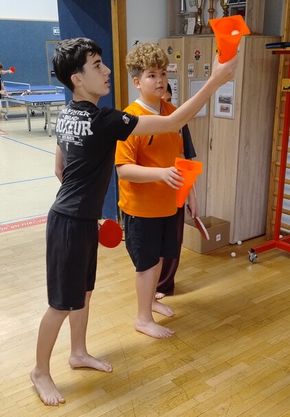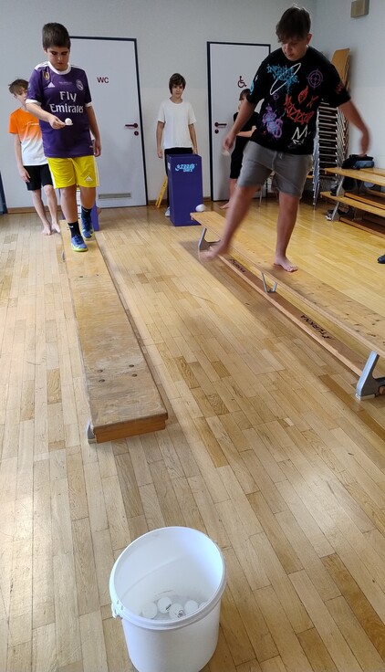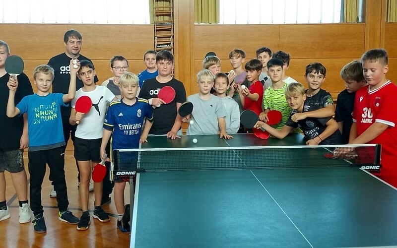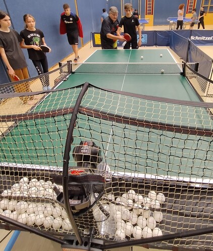 Als die 30 Schülerinnen und Schüler den Turnsaal betreten, sind bereits sechs Tische von den fünf Trainern vorbereitet, um sofort in die Umsetzung zu gehen. Der Tischtennisroboter wird mit besonderer Begeisterung frequentiert. Um alle Teilnehmenden gleichzeitig zu beschäftigen, wartet im Nebenraum ein Geschicklichkeits- und Balancierparcours, um das Ballgefühl zu testen. Traurig über den bereits erfolgten Start war lediglich Matthäus. „Ich darf erst ab Dezember wieder Sport betreiben, weil mir schnelle Bewegungen vom Arzt verboten wurden“, blickt er wehmütig auf seine aktiven Klassenkameraden. Der 12-Jährige hat sich beim Skateboardfahren den Ellbogen ausgekugelt. Auch in seinem Fall gilt dann wohl die alte Weisheit, dass Vorfreude die schönste ist?!