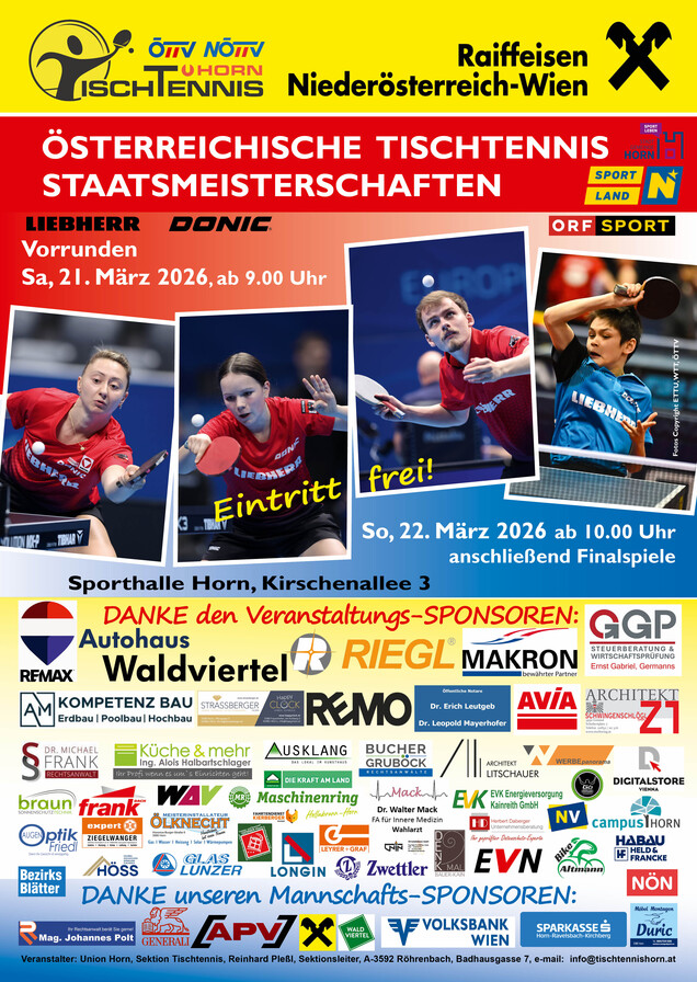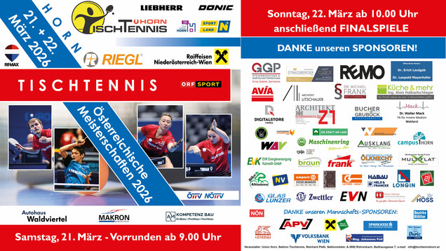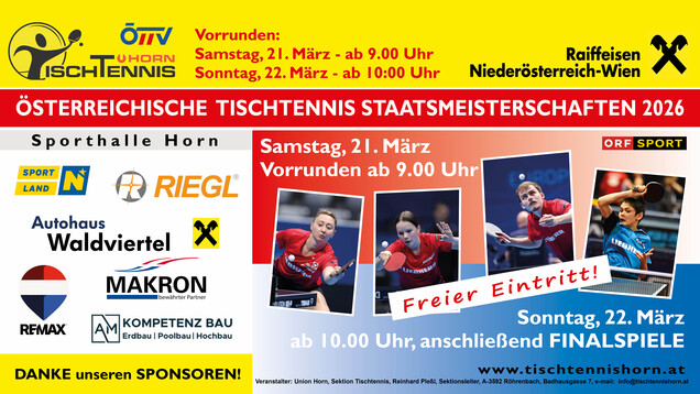 Die Staatsmeisterschaften 2026 finden am 21. und 22. März 2026 in Horn statt, nähere Infos unter: www.tischtennishorn.at .