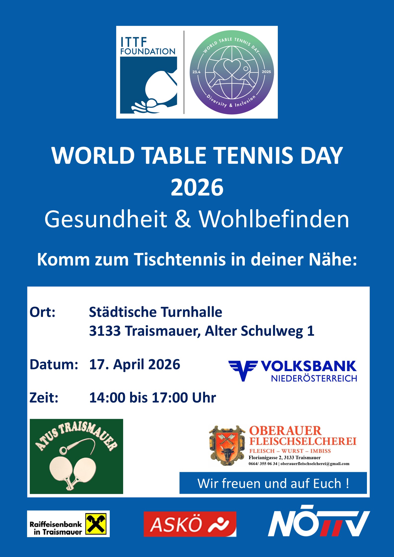 Der ATUS Traismauer richtet anlässlich des World Table Tennis Days am 17. April 2026 von 14:00 bis 17:00 Uhr in der Städtischen TurnhalleTraismauer eine Tischtennisveranstaltung aus.